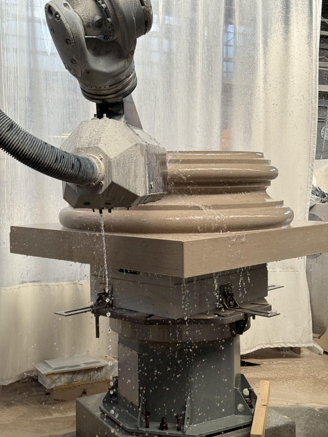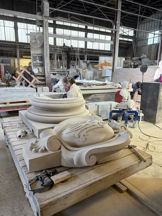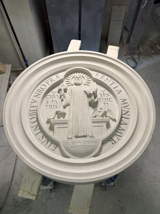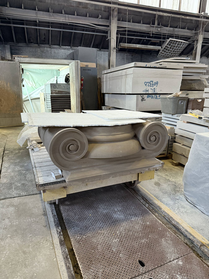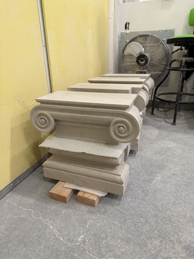 We are always so excited to receive new photos from the great people at Monumental Labs who are doing amazing work. These stone elements were custom carved by Monumental Labs by their computer and finished by hand. This week a large decorative shield, or escutcheon, was finished up, and Ionic capitals and bases for the tower on the Benedictine College Library were finishing up and getting ready to ship.
