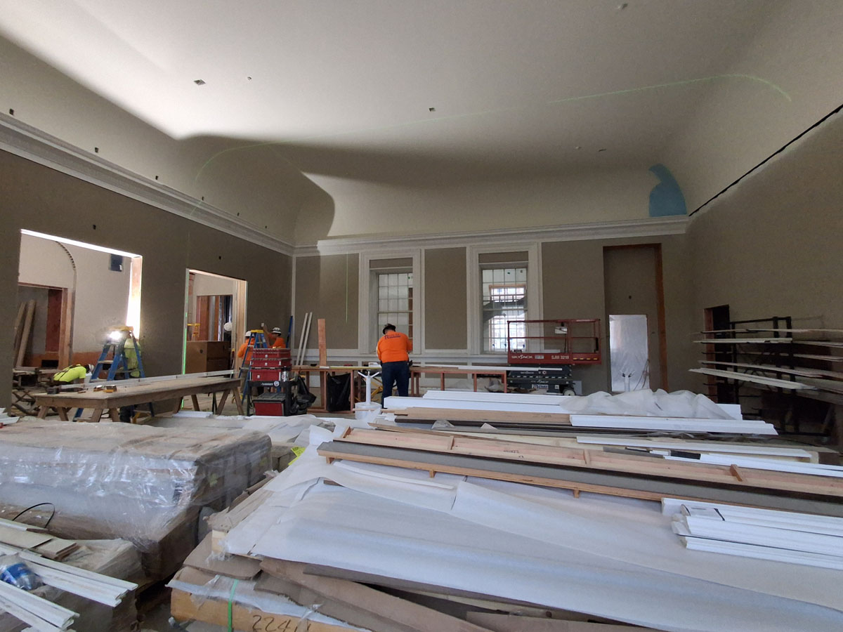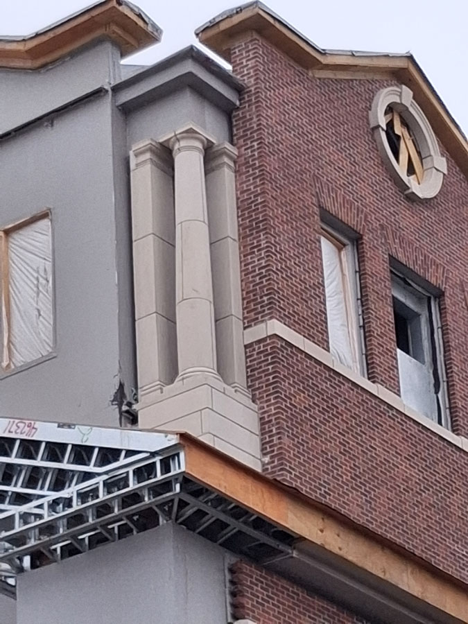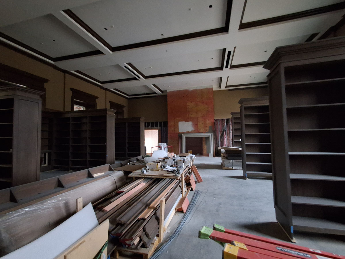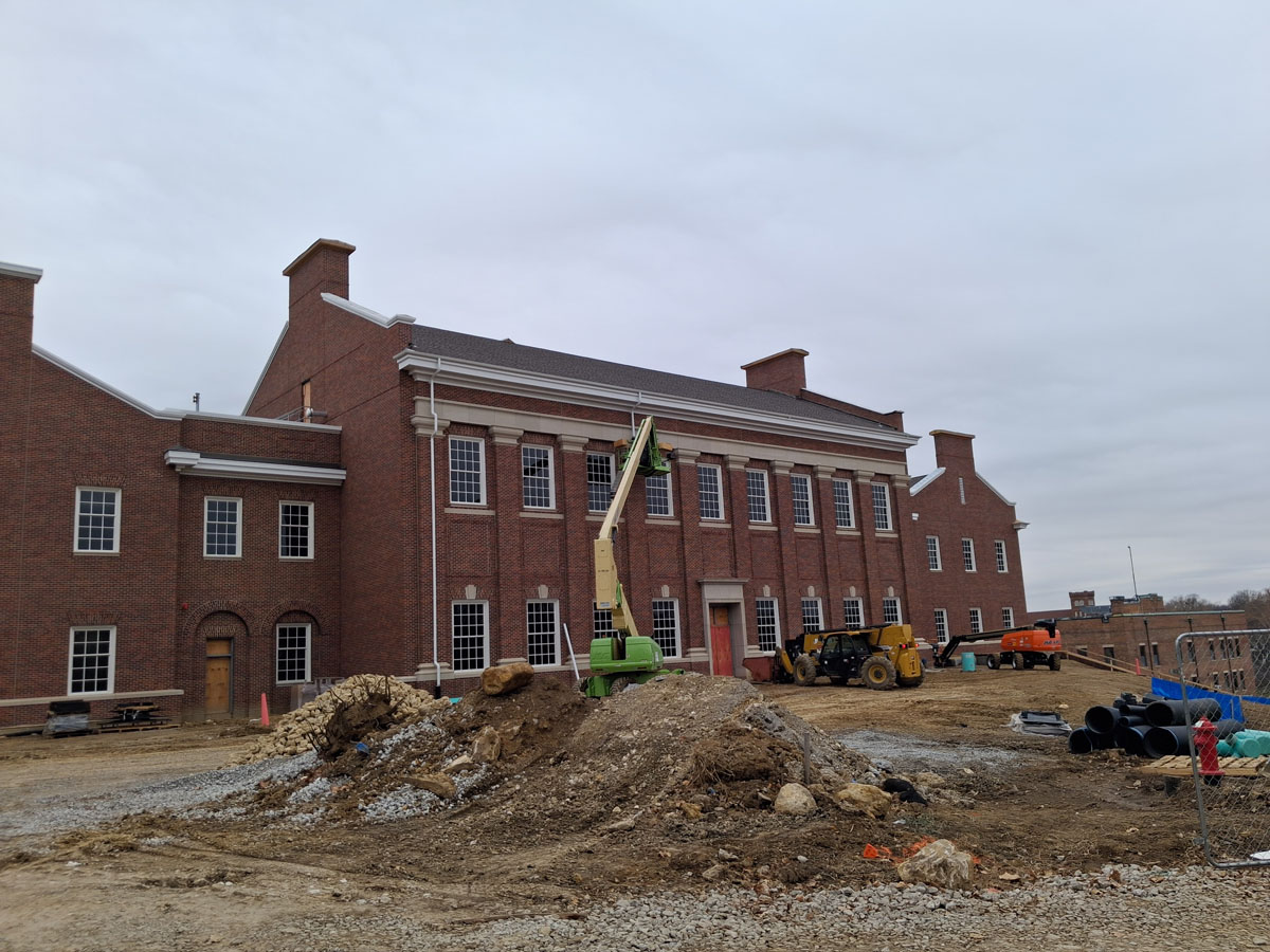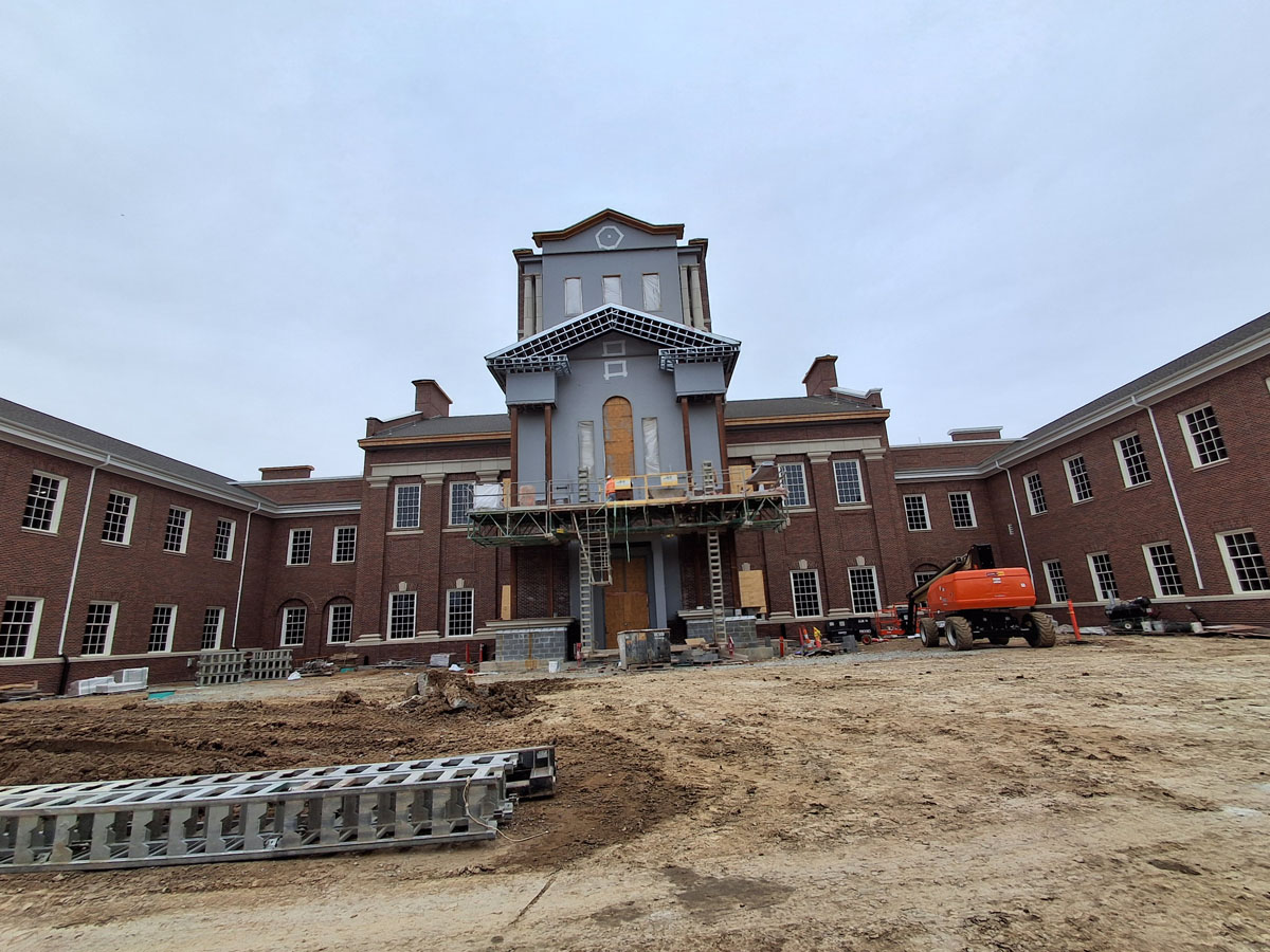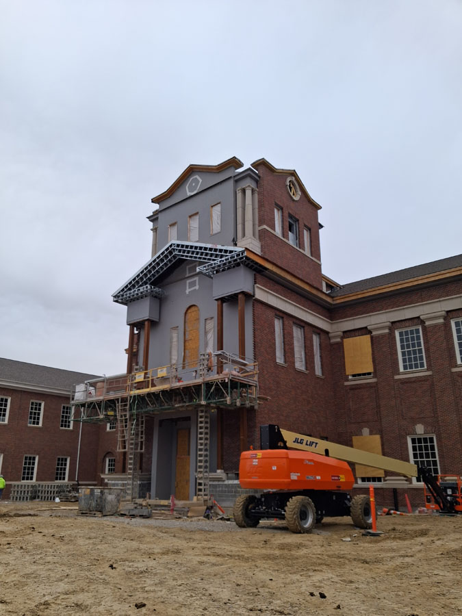 Construction continues apace at Benedictine College and the library tower is taking shape. Columns are in place and ready to be finished out. The exterior brick is nearly finished and the tower is ready for the columns to be installed this next month. The interior of the library reading room, assembly room and multipurpose room are taking shape with trim being installed.