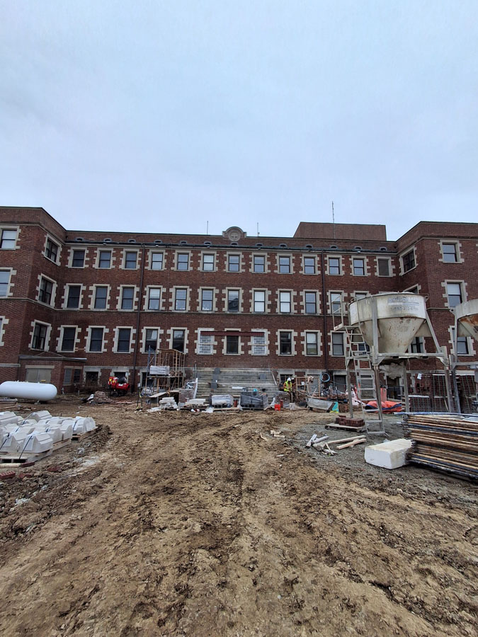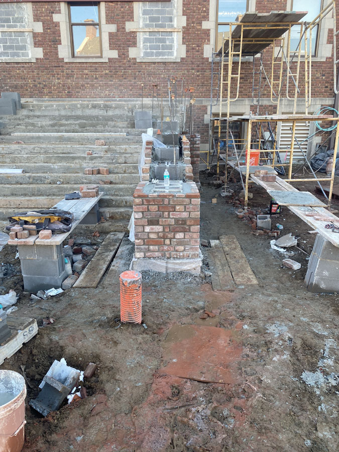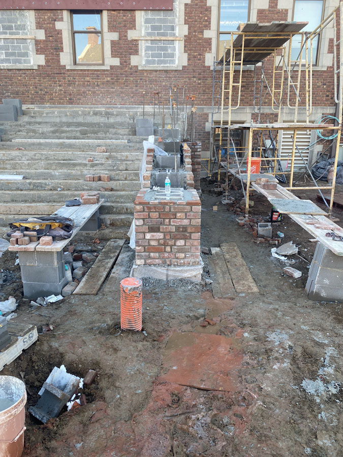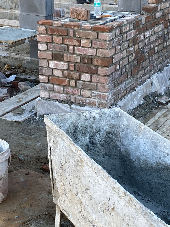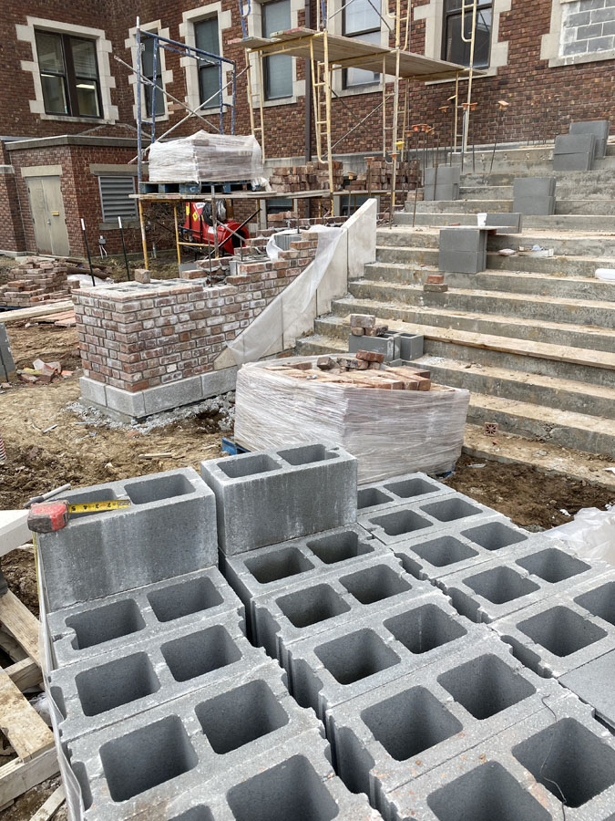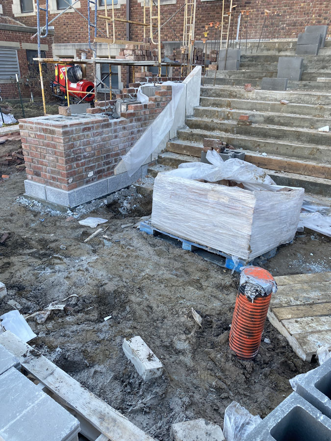 This month brick and masonry started going up for the entry portico. The cheek wall railing is taking shape and getting ready to get the first stone course above. The raking trim for the stair steps is in and ready for the granite step slabs to go in. All the stone is on site and ready to go!