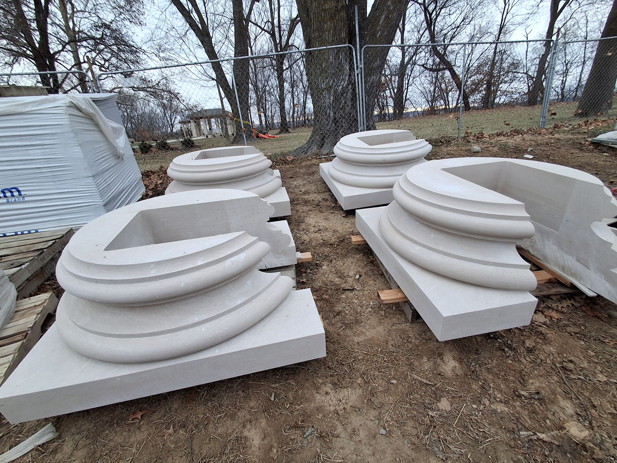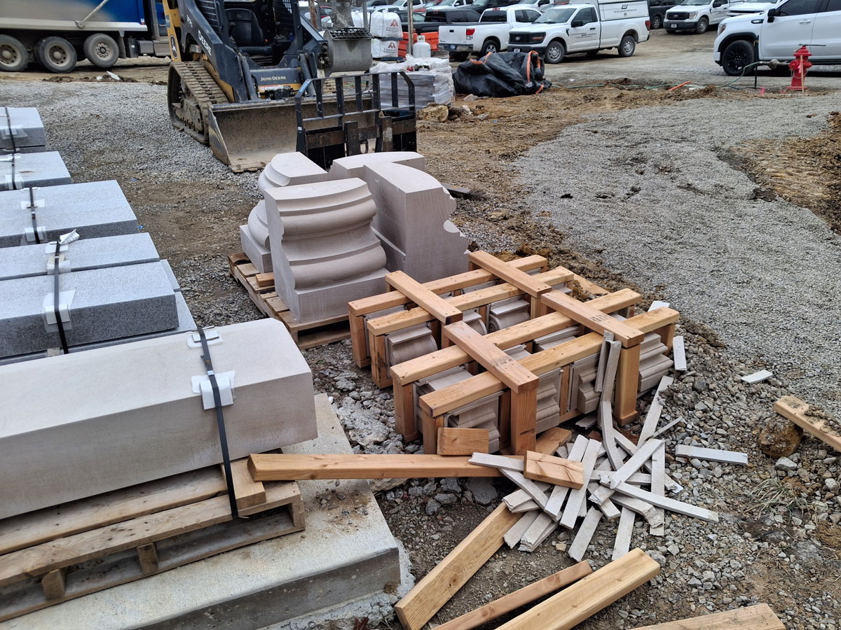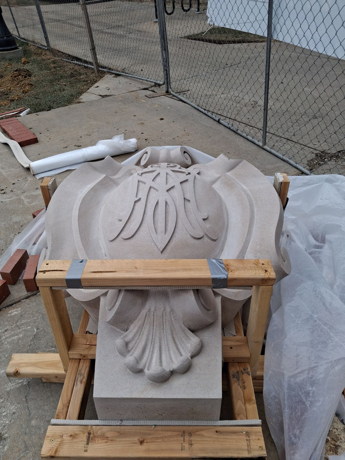Really excited to the first delivery of stone carved by the great people at Monumental Labs. Full limestone capitals and bases for the main columns on the façade of the Library are ready to go in, and other small details and the St. Benedict Medallions for the St. Benedict Hall Entry project.