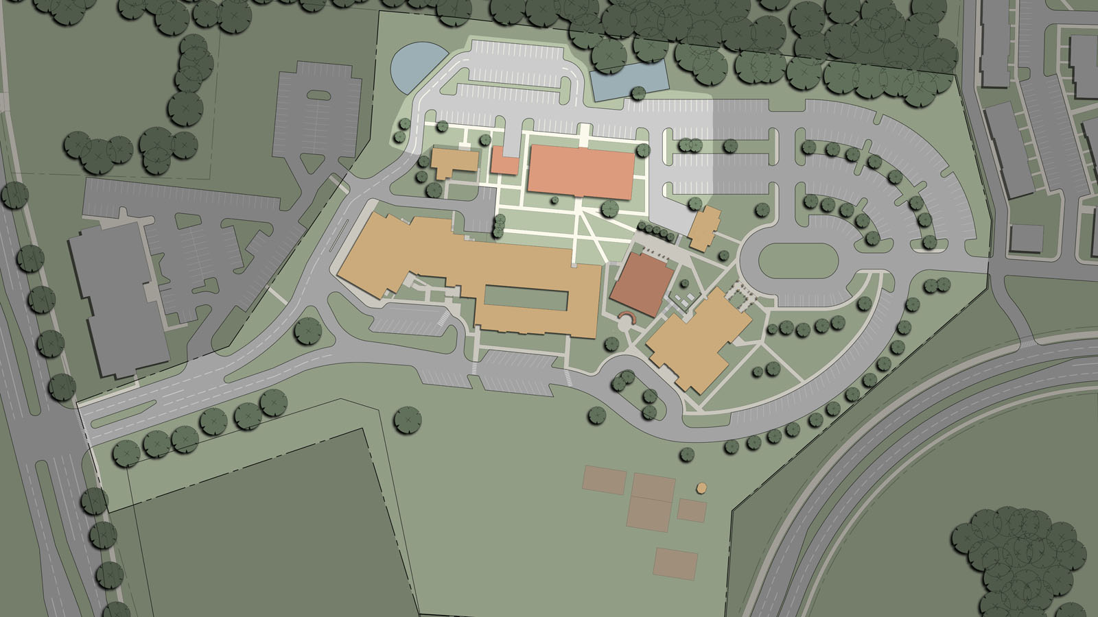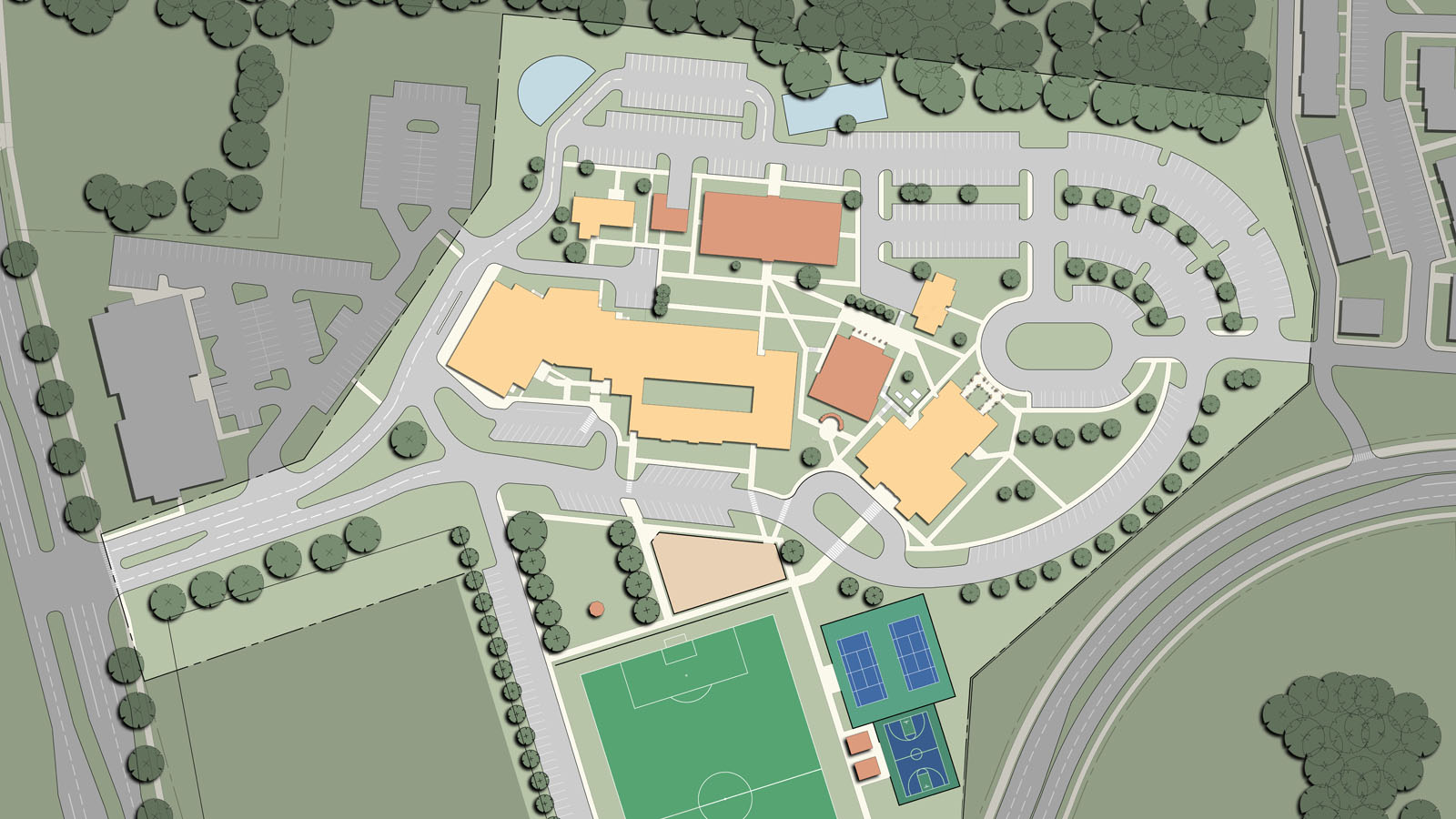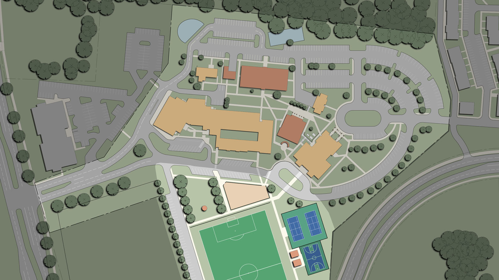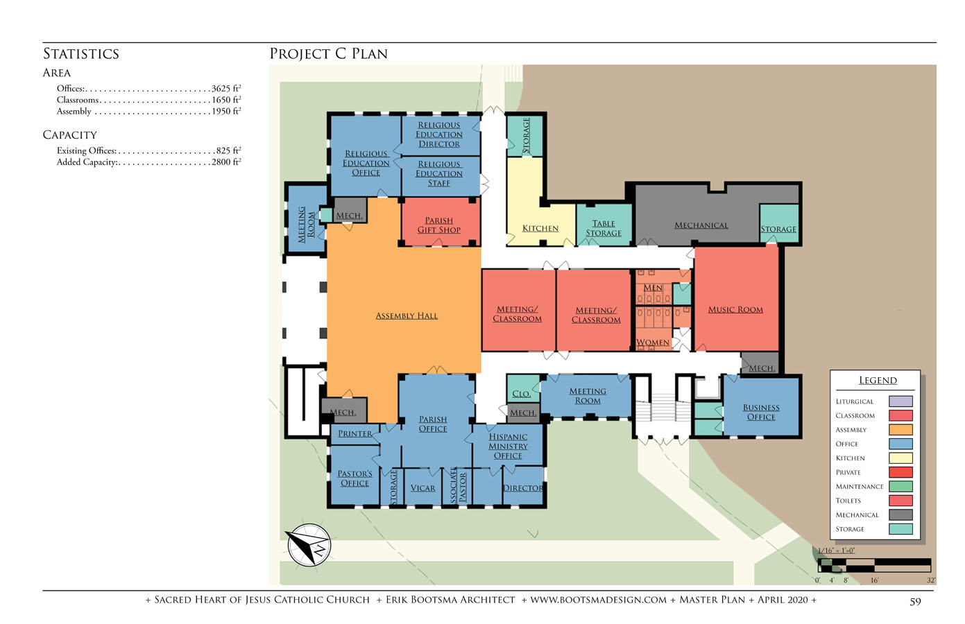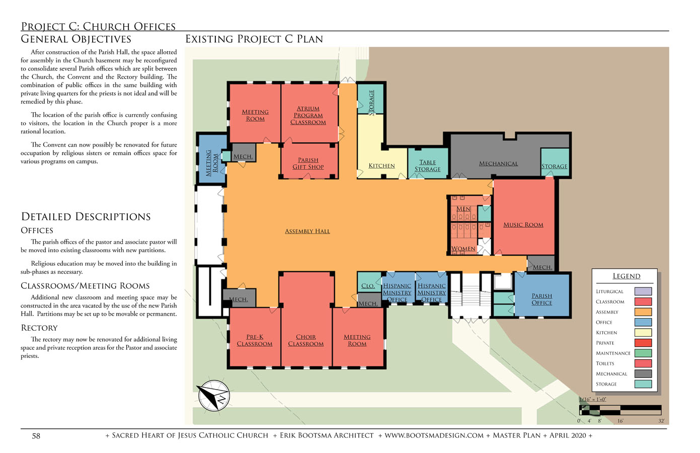 The parish consists of an 800-seat church, rectory, former convent and a K-8 school of 225 students which have all reached capacity. The master plan provides a campus master plan to evaluate the best options to pursue to expand and reorganize the campus. The plan was completed after a thorough survey, documentation and analysis phase, a draft program review and the drafting of a final master plan.