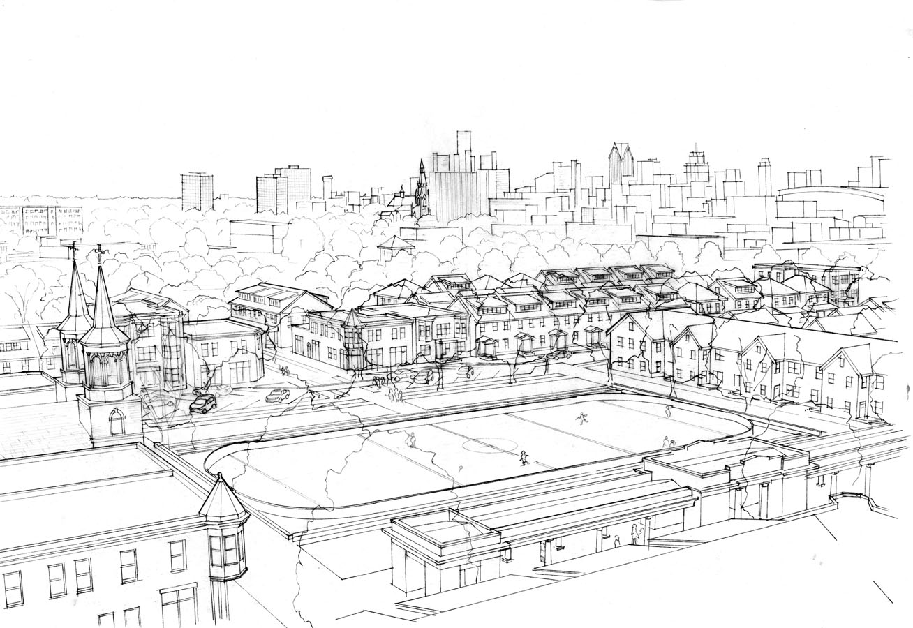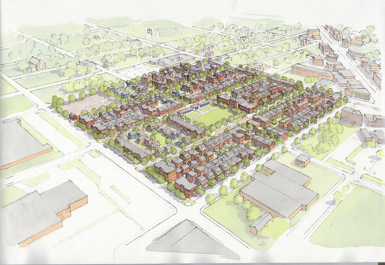Comprising eight blocks near the heart of Detroit, this project is a proposed urban village that is planned to provide a physical home for the parishioners of a nearby urban church. The parish draws people from well outside of the city and the purpose of this development would allow them to live in community.