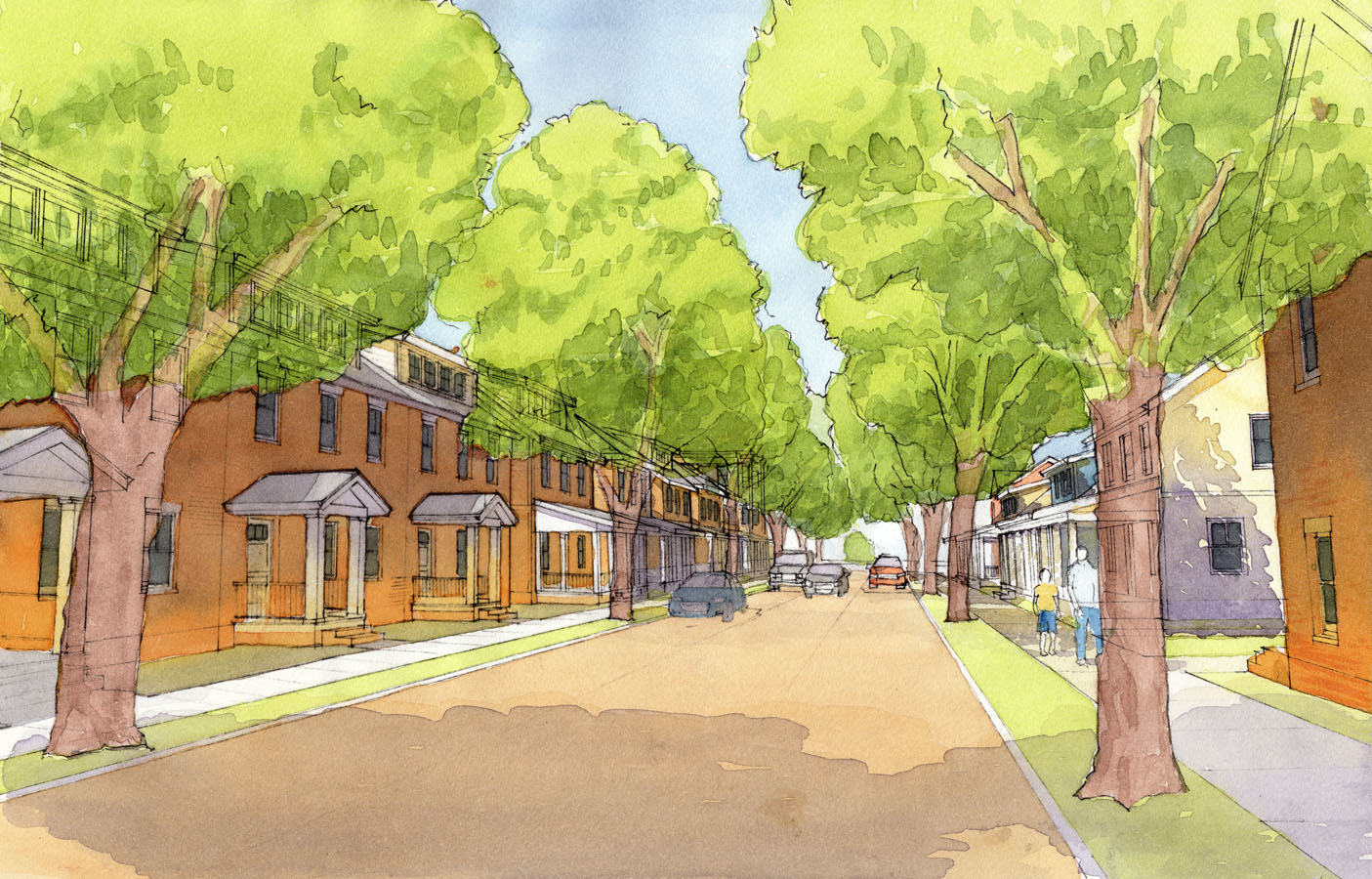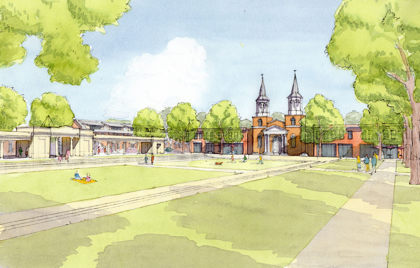 The plan is centered around a terraced urban park, where outdoor activities such as concerts, festivals and outdoor skating in the winter would provide life to the neighborhood.