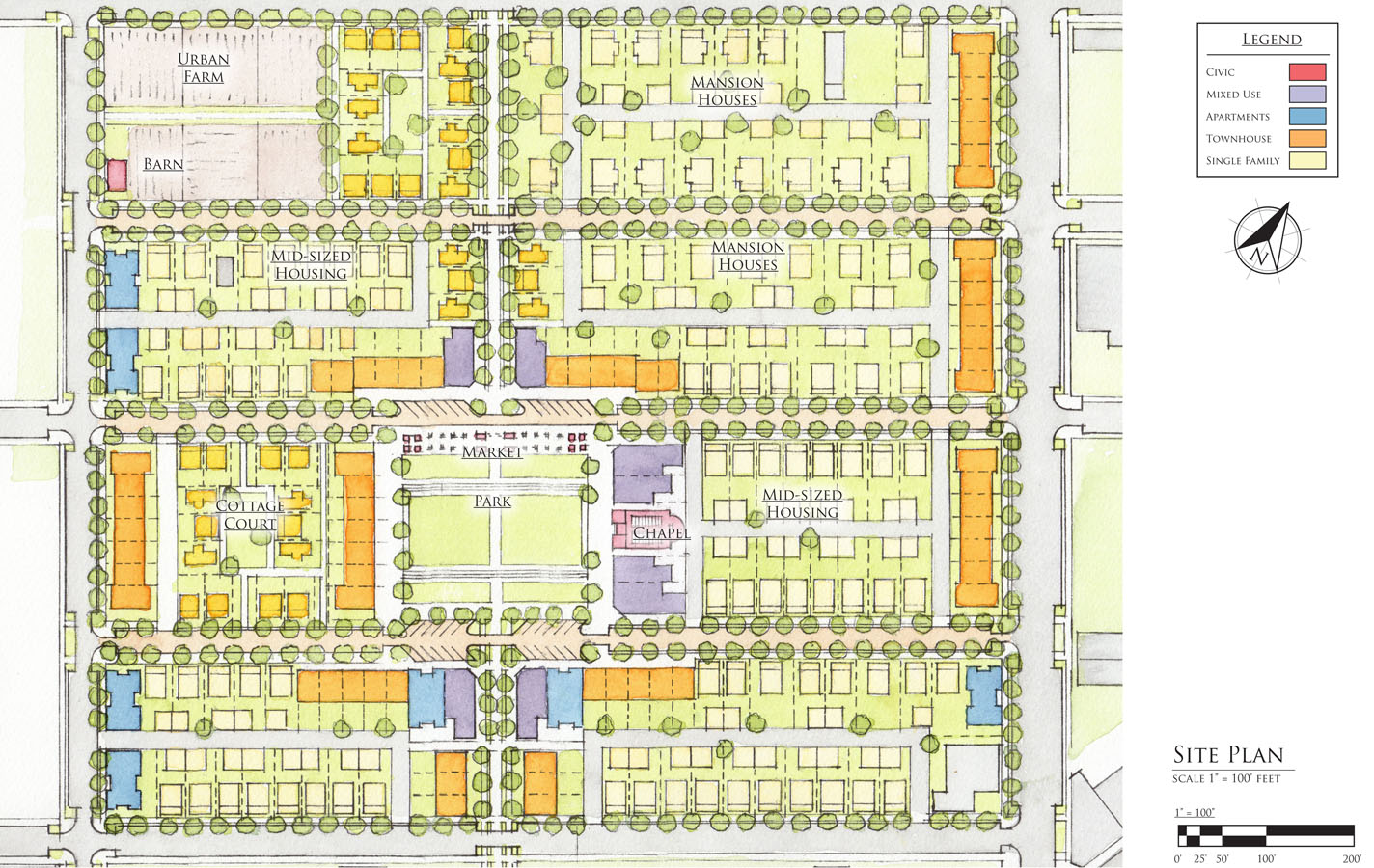 Along with a mix of commercial and small office space, the housing in the neighborhood would range from large single family houses, to small houses, cottage courts and apartment units and live/work units. The variety of sizes would allow parishioners in every stage of life, from young adults to retirees and “empty nesters” to have a place they could afford to live in community together.