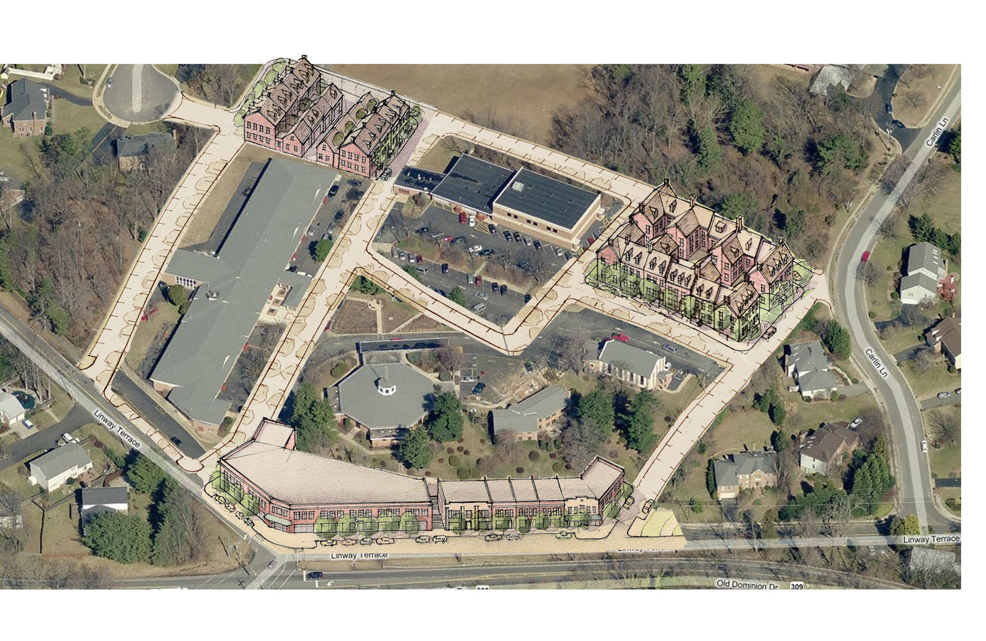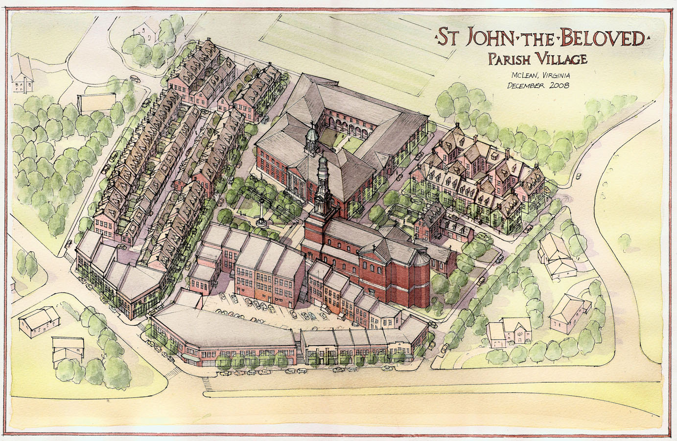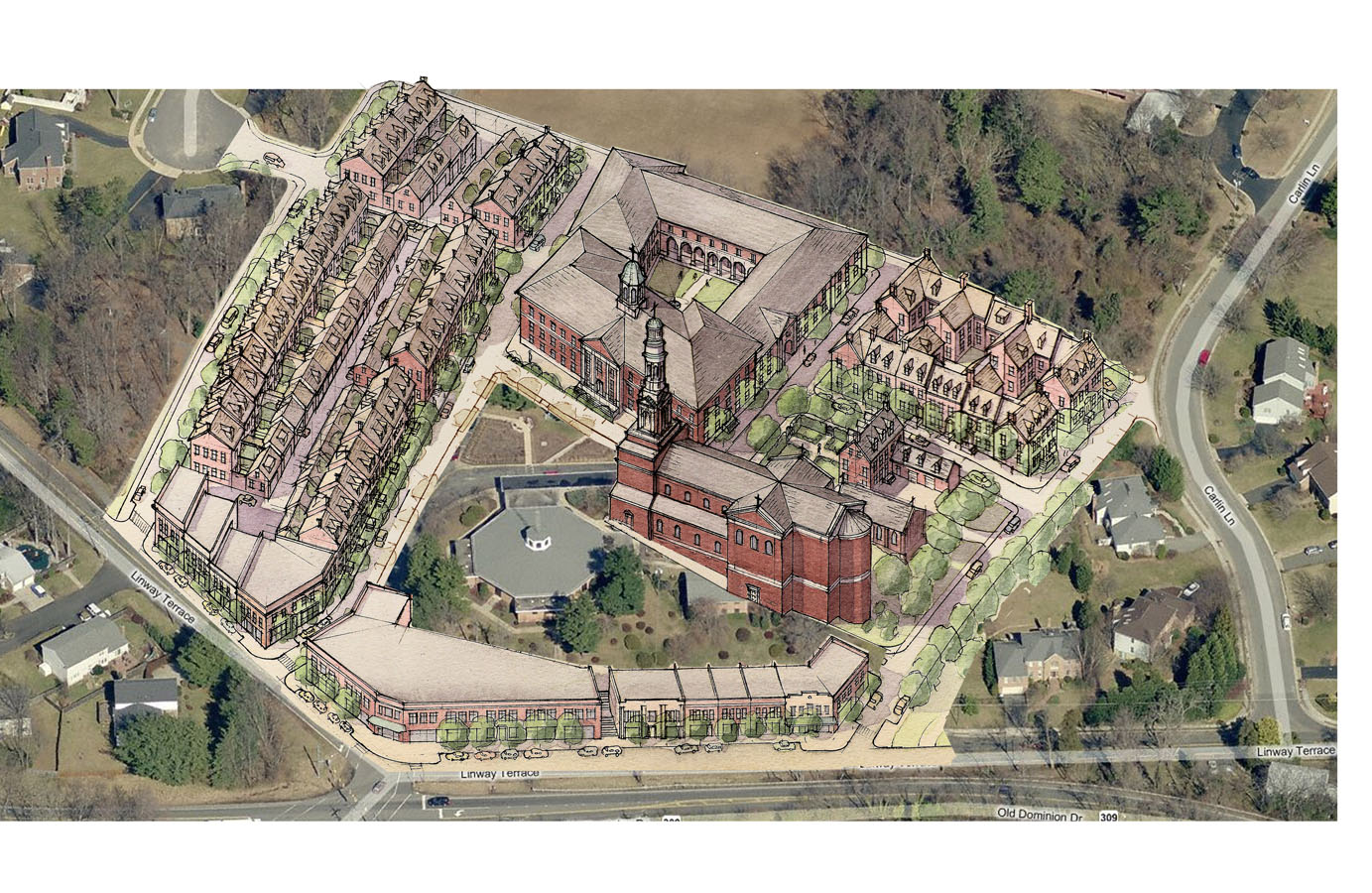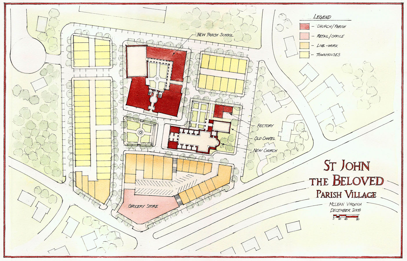 This proposal would turn those parking lots which are 90% of the time unused into a revenue generating urban village.Townhomes and a small block of apartment and mixed used buildings would form a small park in front of a church and parish school.