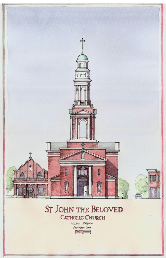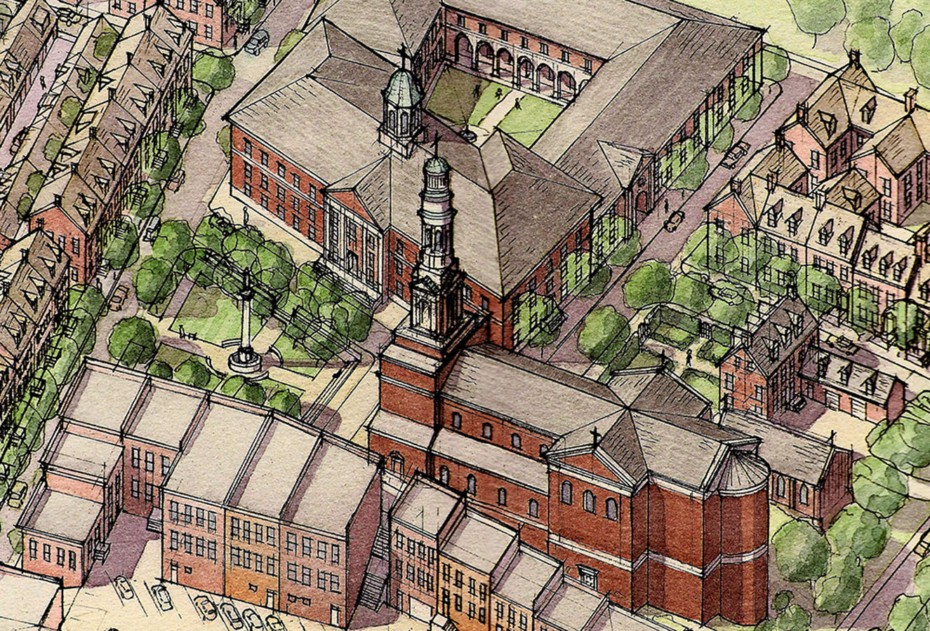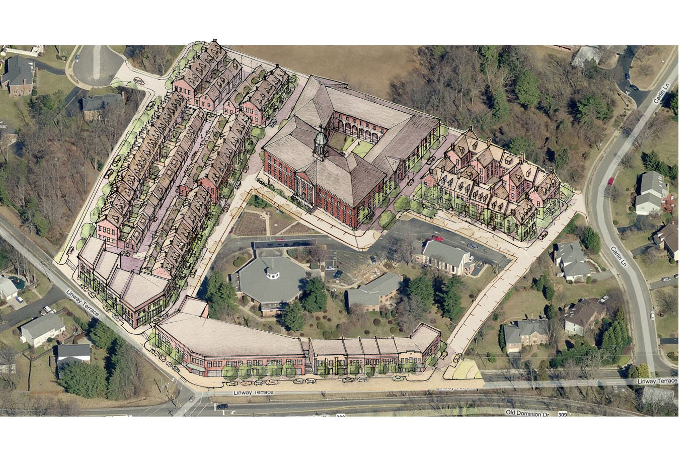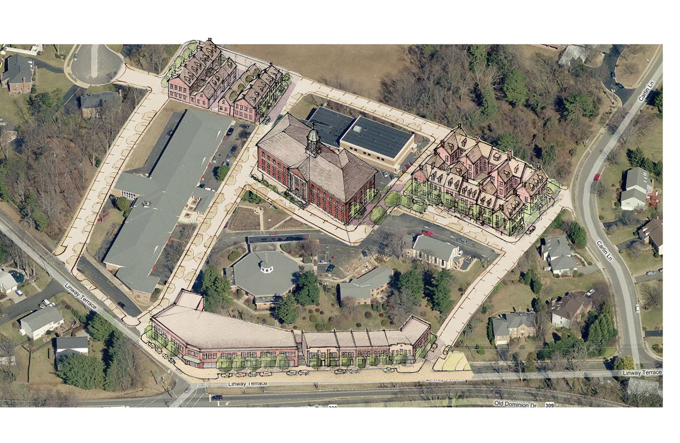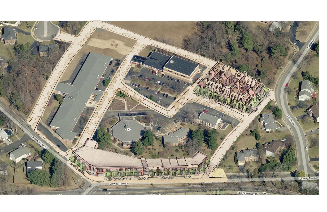 This proposal would turn those parking lots which are 90% of the time unused into a revenue generating urban village.Townhomes and a small block of apartment and mixed used buildings would form a small park in front of a church and parish school.