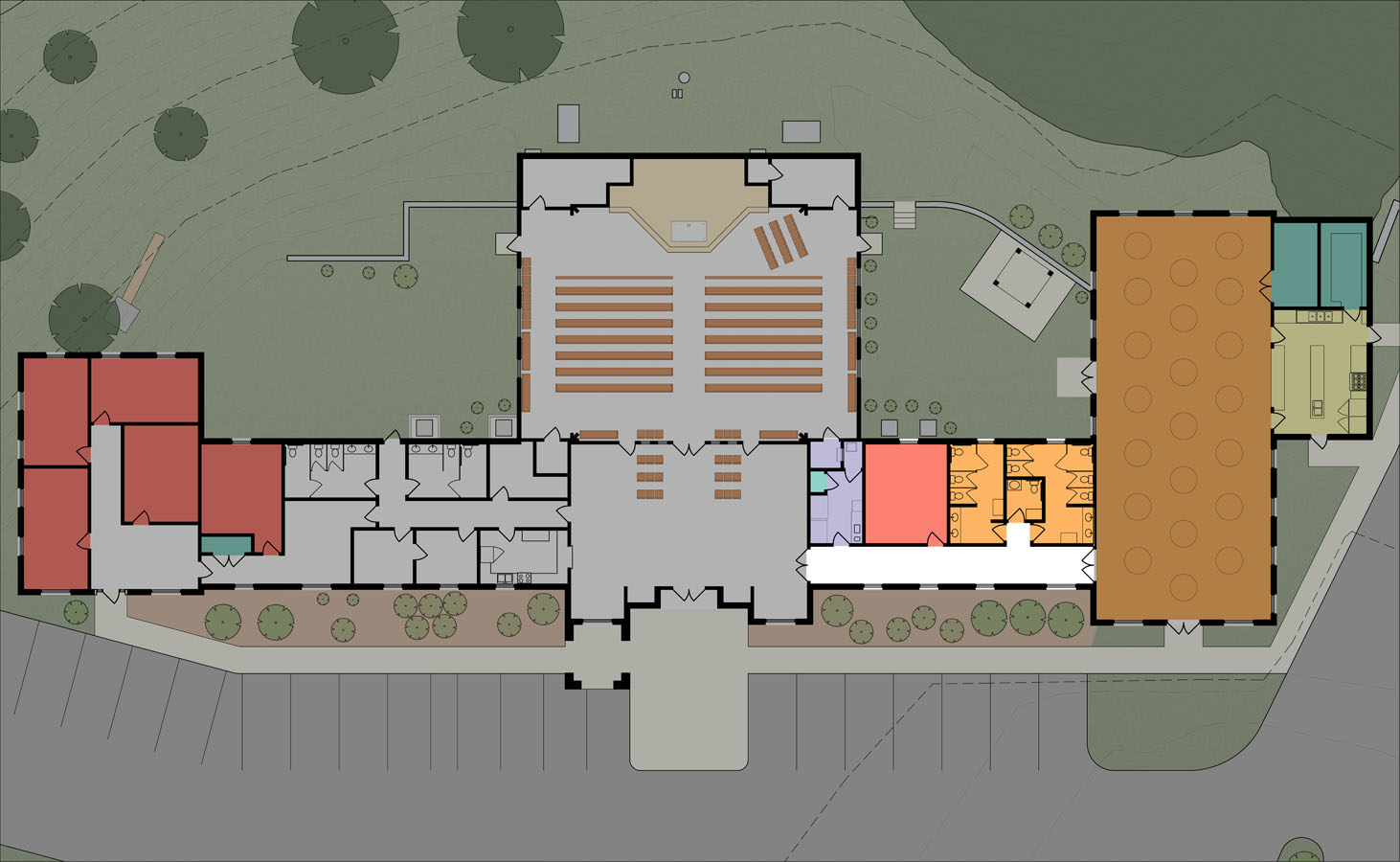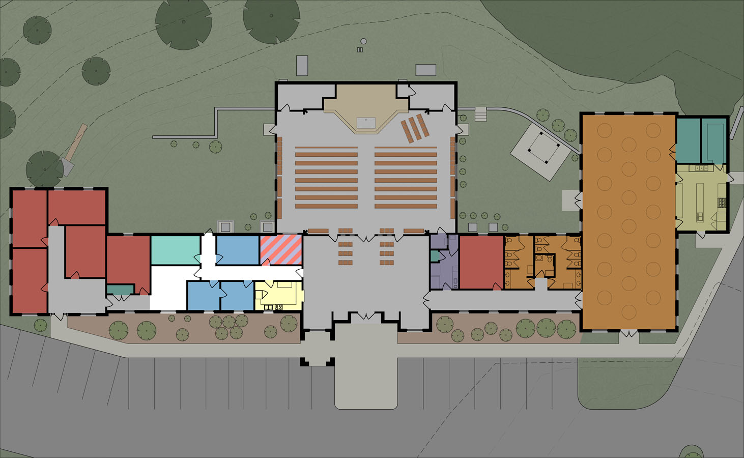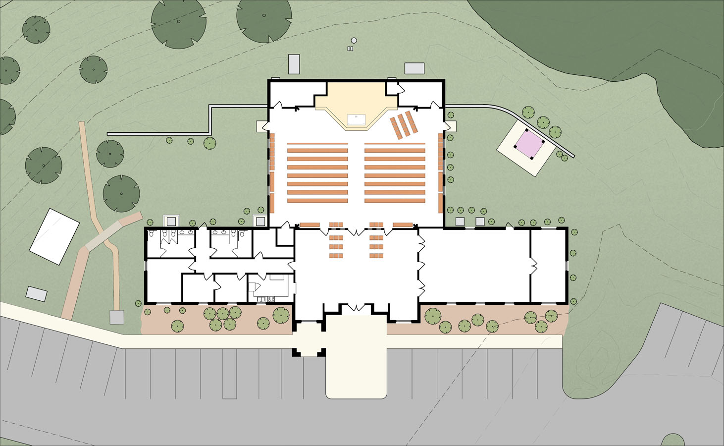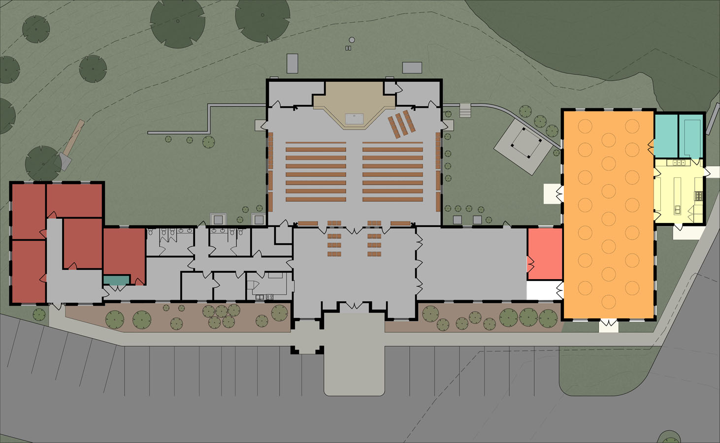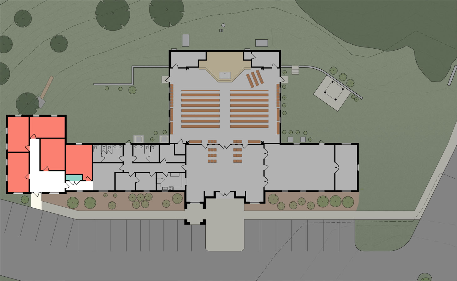 This small master plan was commissioned by the parish to help guide a growing congregation which had a severely constrained site and needed to properly plan the growth of their building and grounds to be able to fit in their many needs.