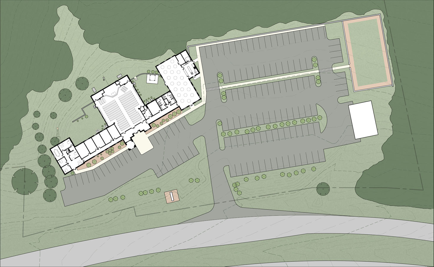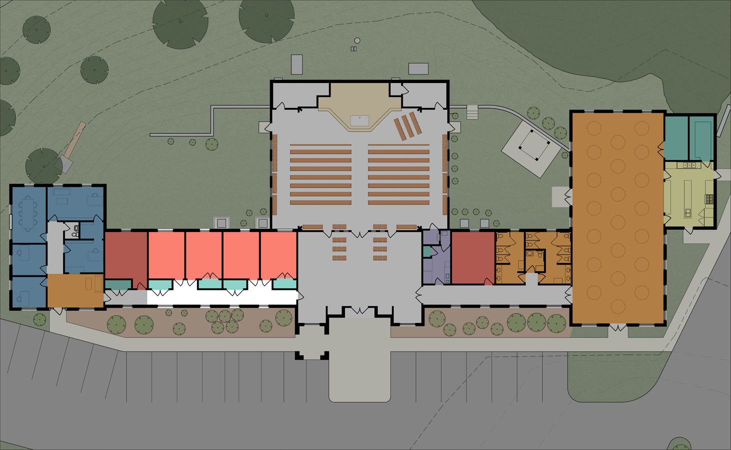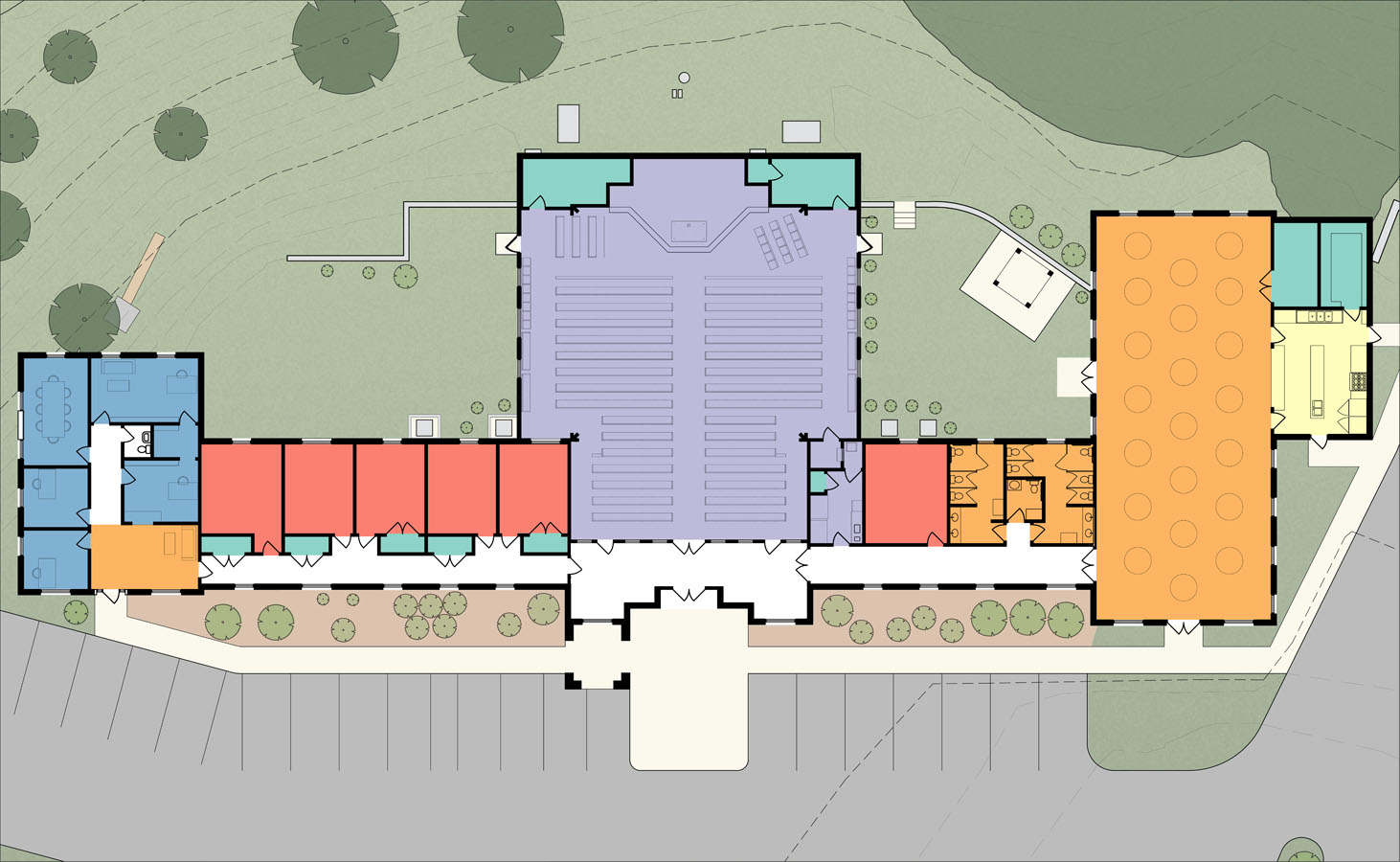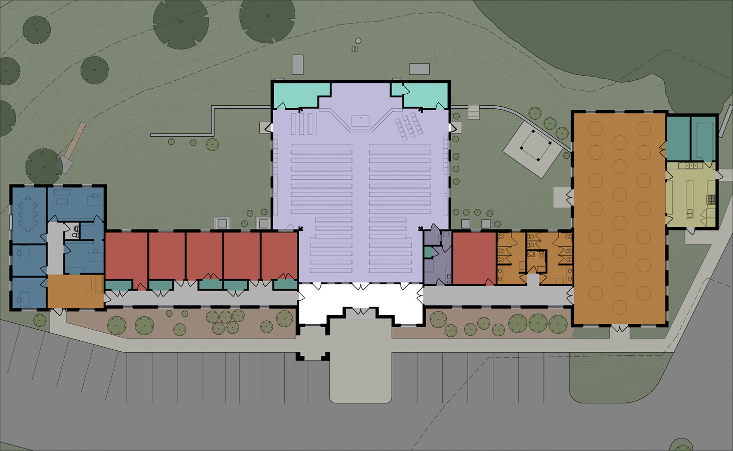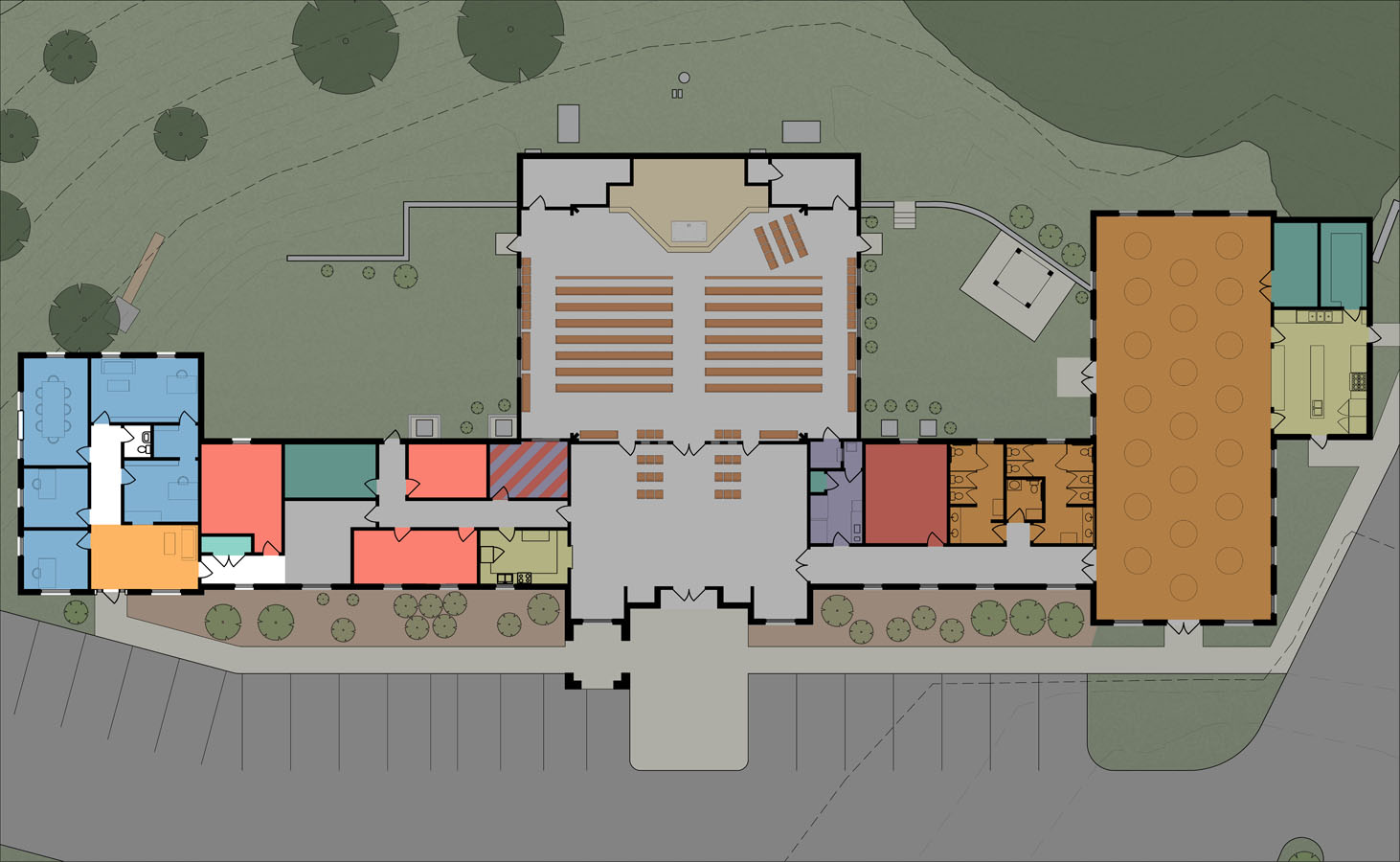 This small master plan was commissioned by the parish to help guide a growing congregation which had a severely constrained site and needed to properly plan the growth of their building and grounds to be able to fit in their many needs.
