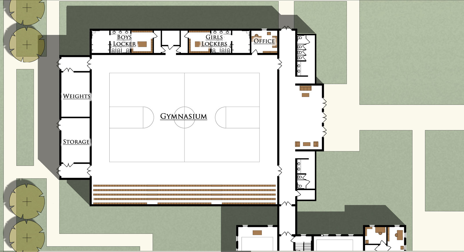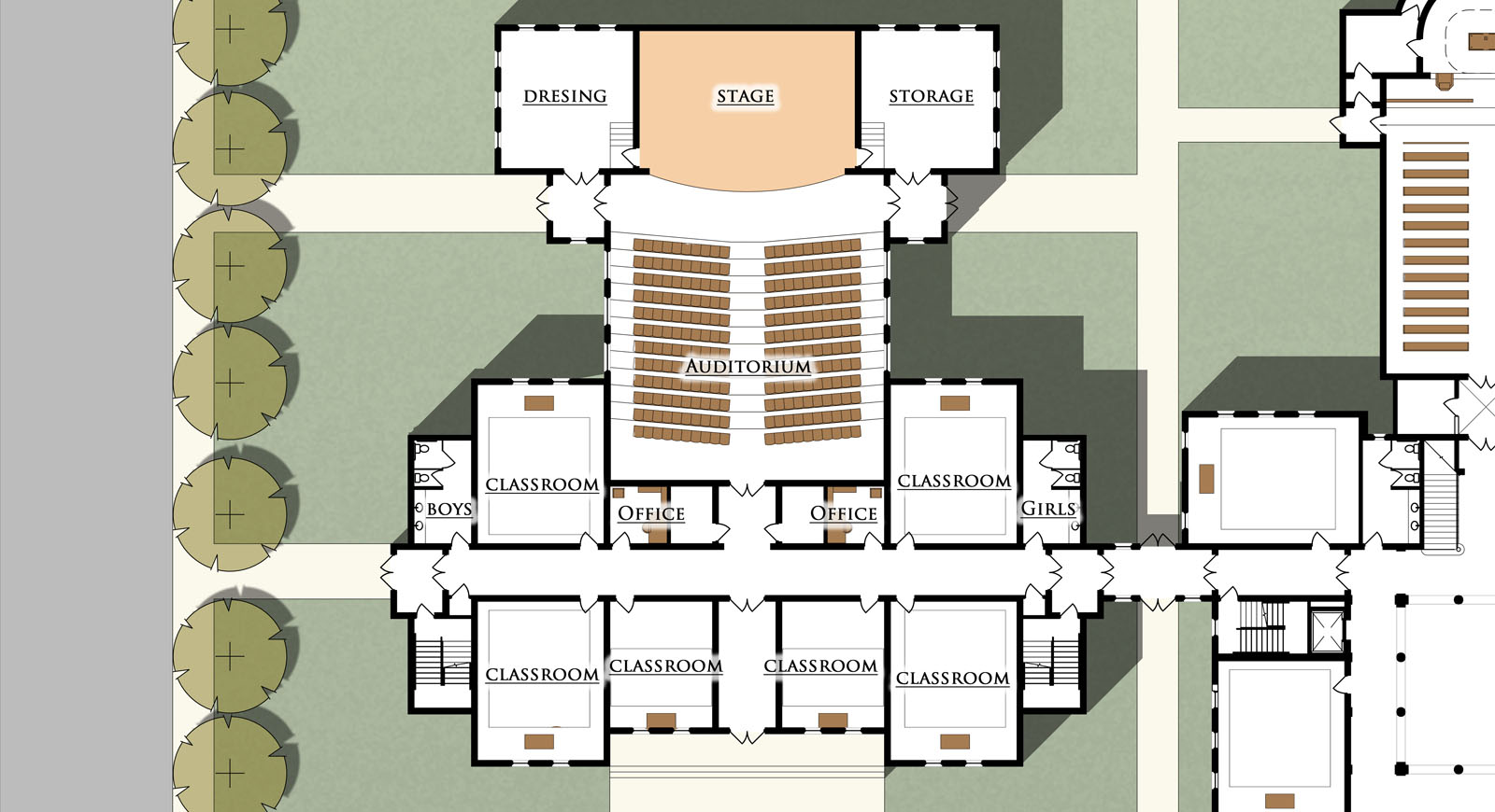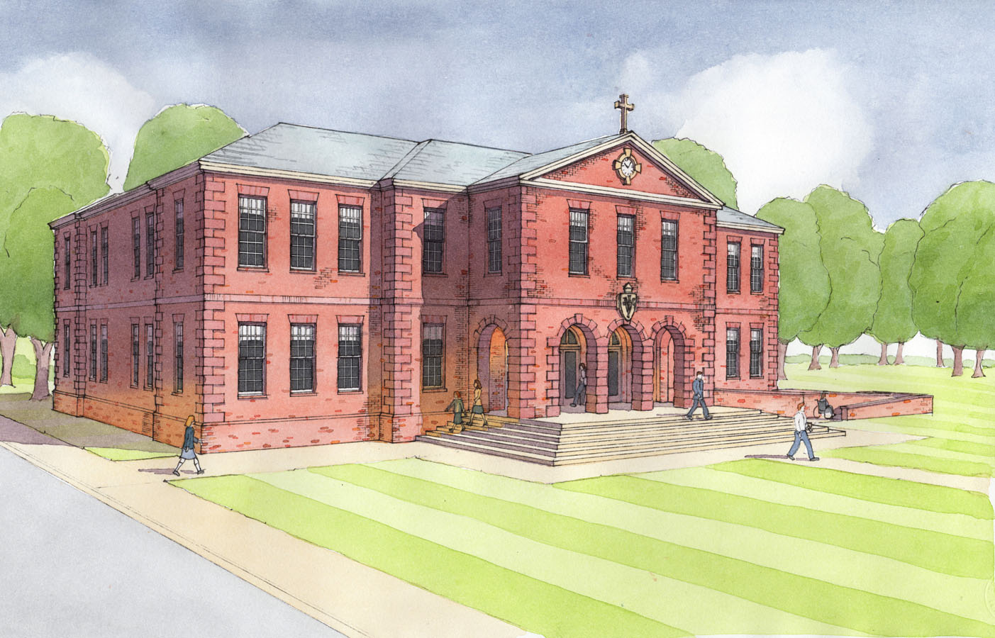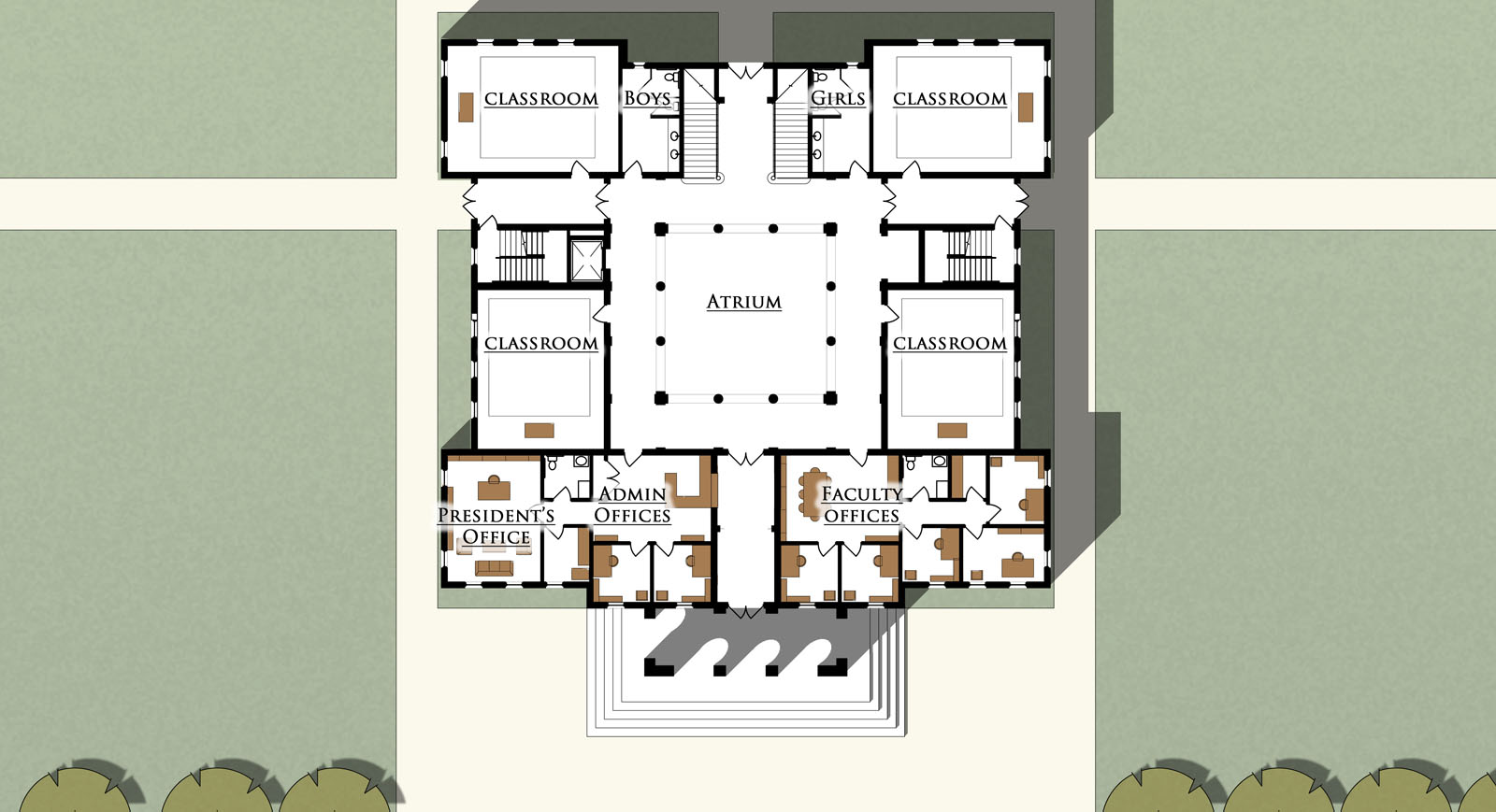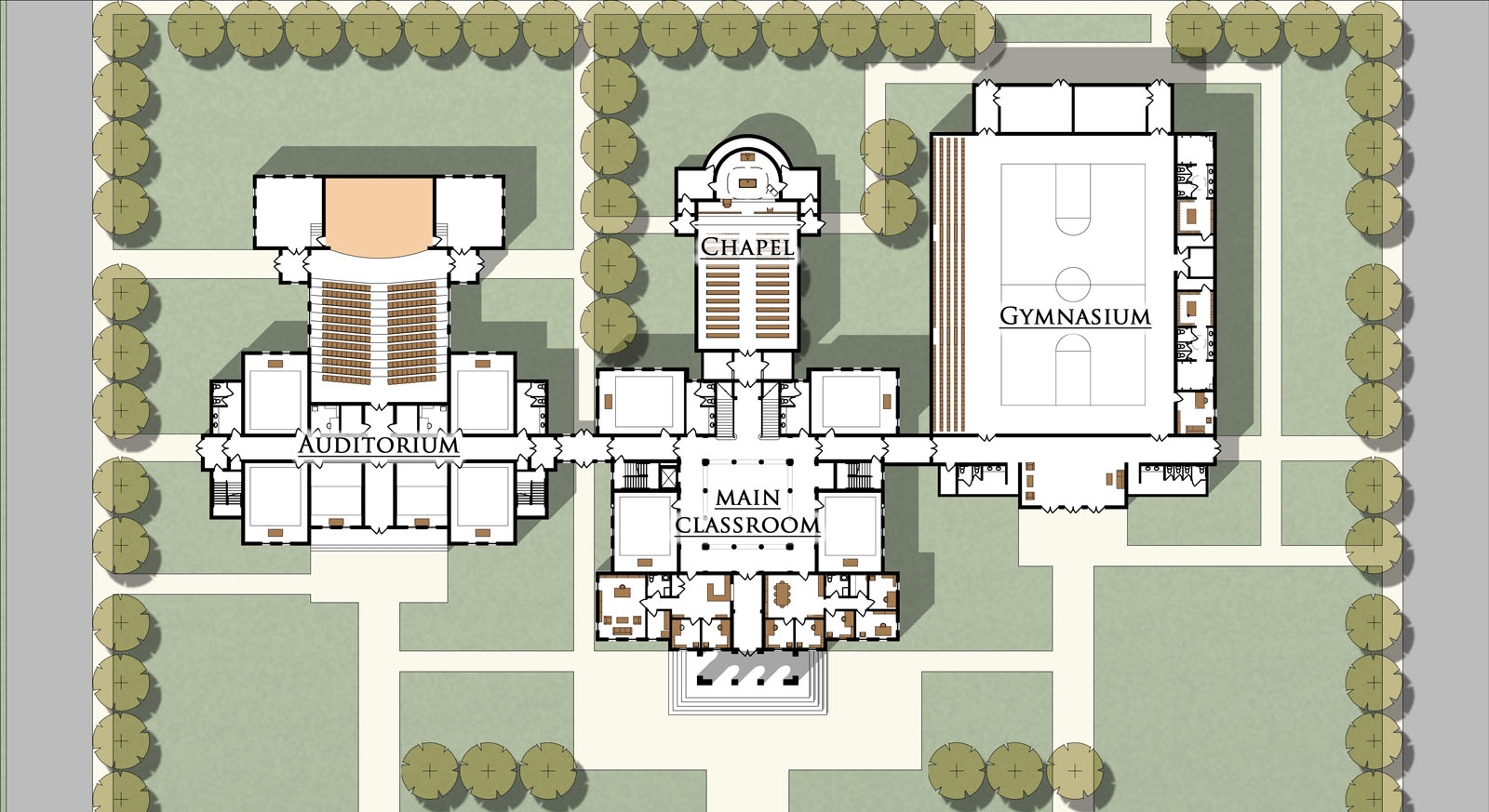 The school would consist of an original main block, shown here which was designed around a central atrium. The school would be expandable in several phases, including a gymnasium wing, chapel and auditorium wing.