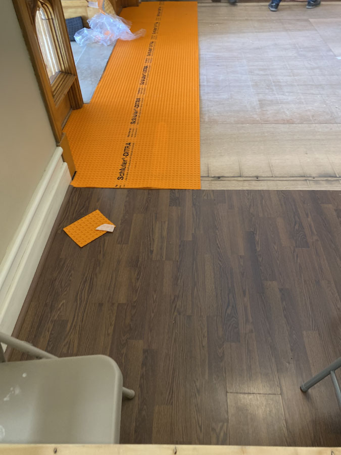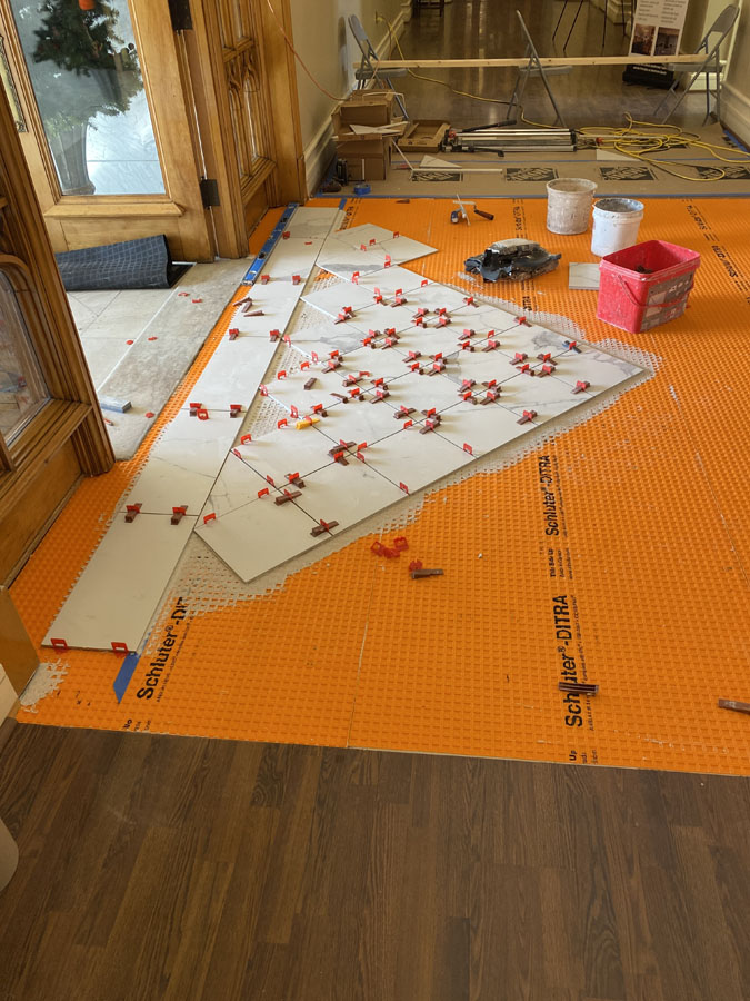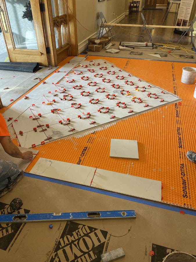 Work over Christmas break is moving along, and new marble flooring connecting the old entry to the new vestibule floor is going in. This marble floor matches the old entry and forms a clear path through the building from the south to the new north entry. This will be finished for classes to start up next week.