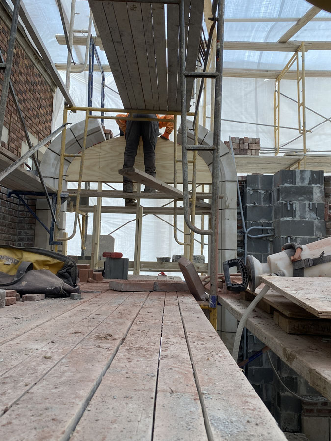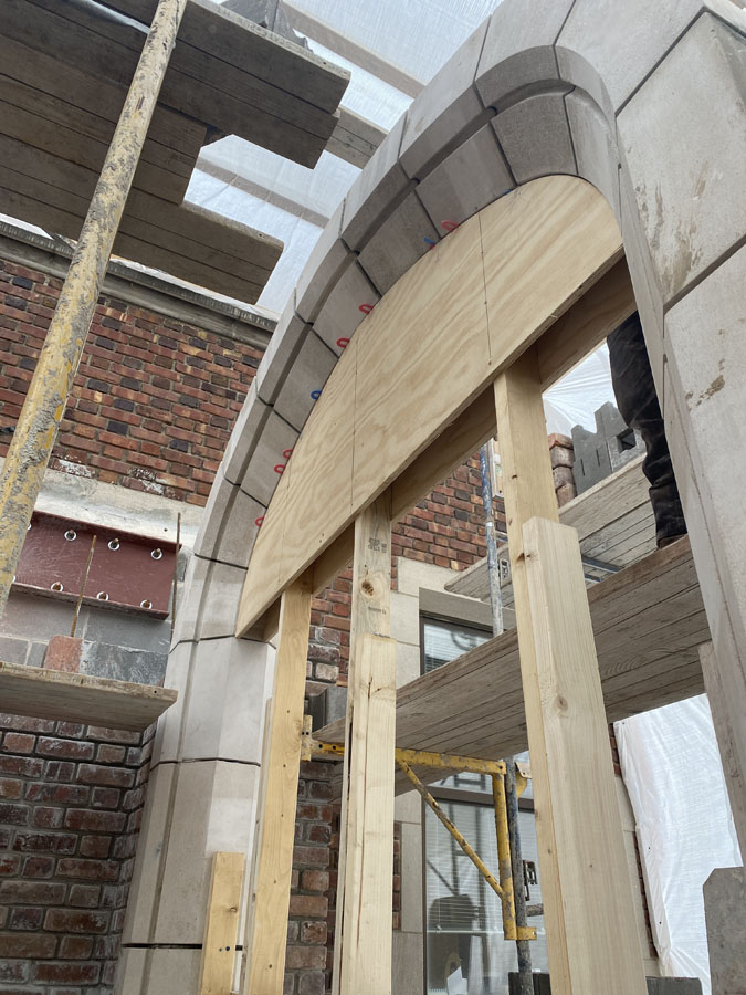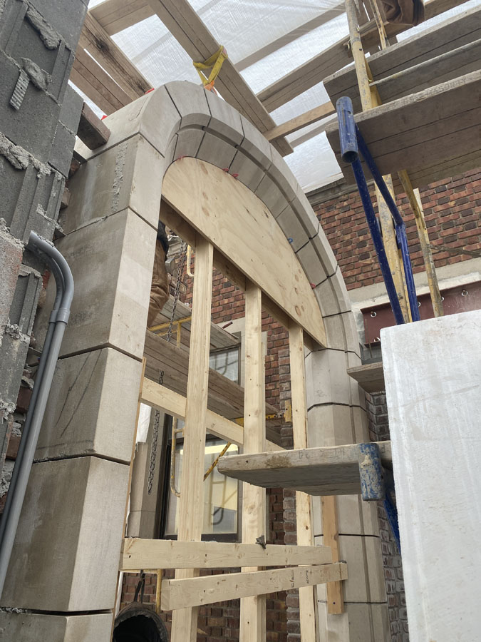 Exciting progress this month on masonry on the St. Benedict Hall entry portico at Benedictine College. The stone arches on the sides of the portico have been laid and the keystone is set. These are solid stone masonry blocks so no steel needed to hold these up at all. The main entry arch should be going up soon, so keep checking back.